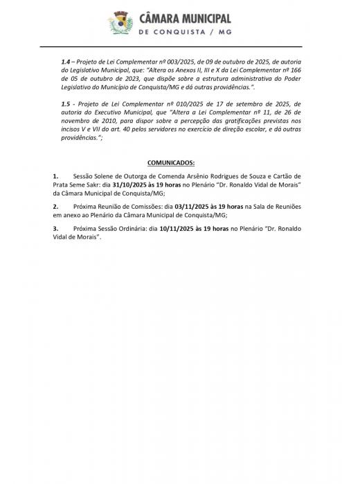 Acontece amanhã sexta-feira, dia 24/10 no Plenário Dr. Ronaldo Vidal de Morais, a 18ª Sessão Ordinária da Câmara Municipal de Conquista, às 19h.