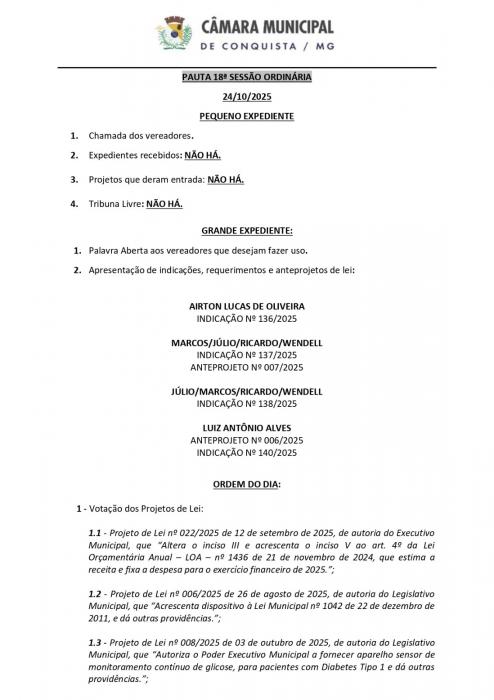18ª Pauta Resumida da Sessão Ordinária