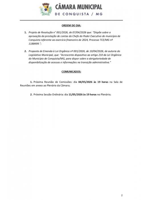 A Câmara Municipal de Conquista convida toda a população para participar da 7ª Sessão Ordinária de 2026, que será realizada na próxima segunda-feira (27/04/2026), às 19h, no Plenário da Câmara.
