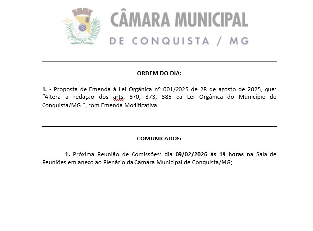 A Câmara Municipal de Conquista convida toda a população para participar da 1ª Sessão Ordinária de 2026, que será realizada na próxima segunda-feira, às 19h, no Plenário da Câmara.