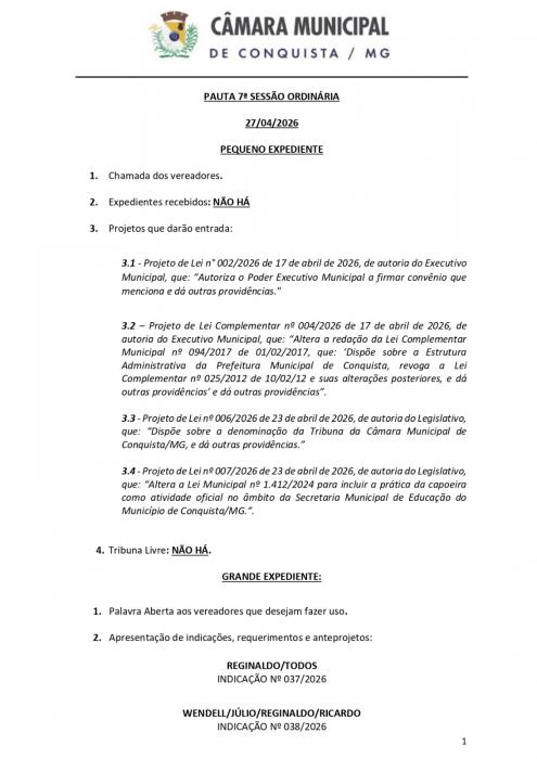 A Câmara Municipal de Conquista convida toda a população para participar da 7ª Sessão Ordinária de 2026, que será realizada na próxima segunda-feira (27/04/2026), às 19h, no Plenário da Câmara.